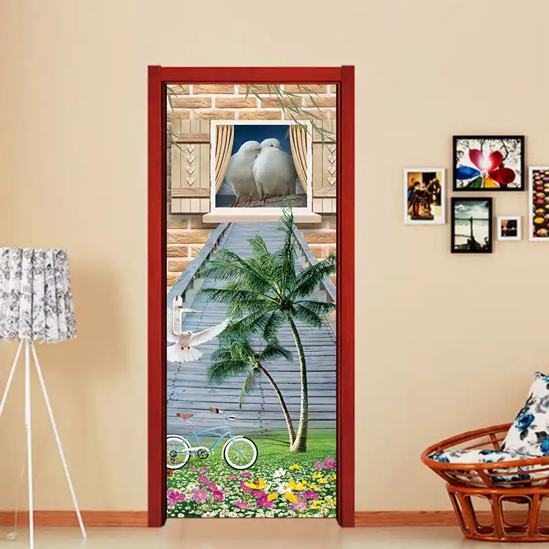 Pigeon Coconut Tree Roads Frame Fridge Door Sticker Pvc Self