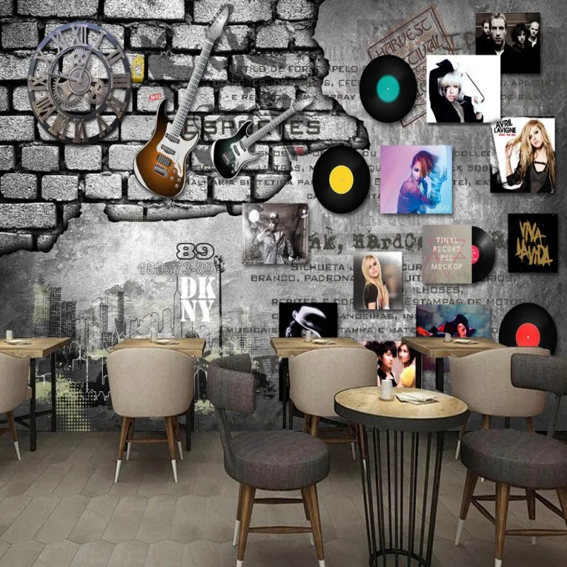 Custom 3d Mural European Retro Rock Music Album Wall Watch Bar