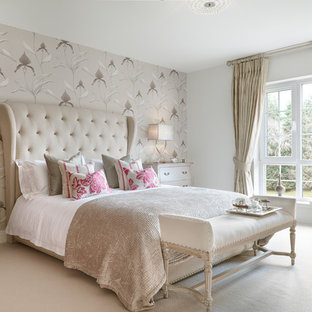 A Traditional Bedroom With Pattern Wallpaper A Double Bed With