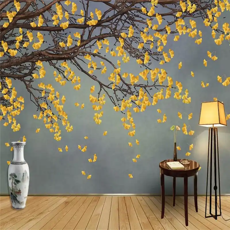 Chinese Style Hand Painted Ginkgo Background Wall Professional