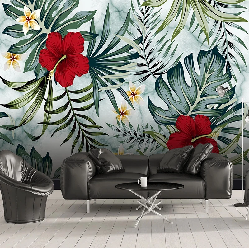 Custom 3d Wall Murals European Red Flowers Tropical Leaves