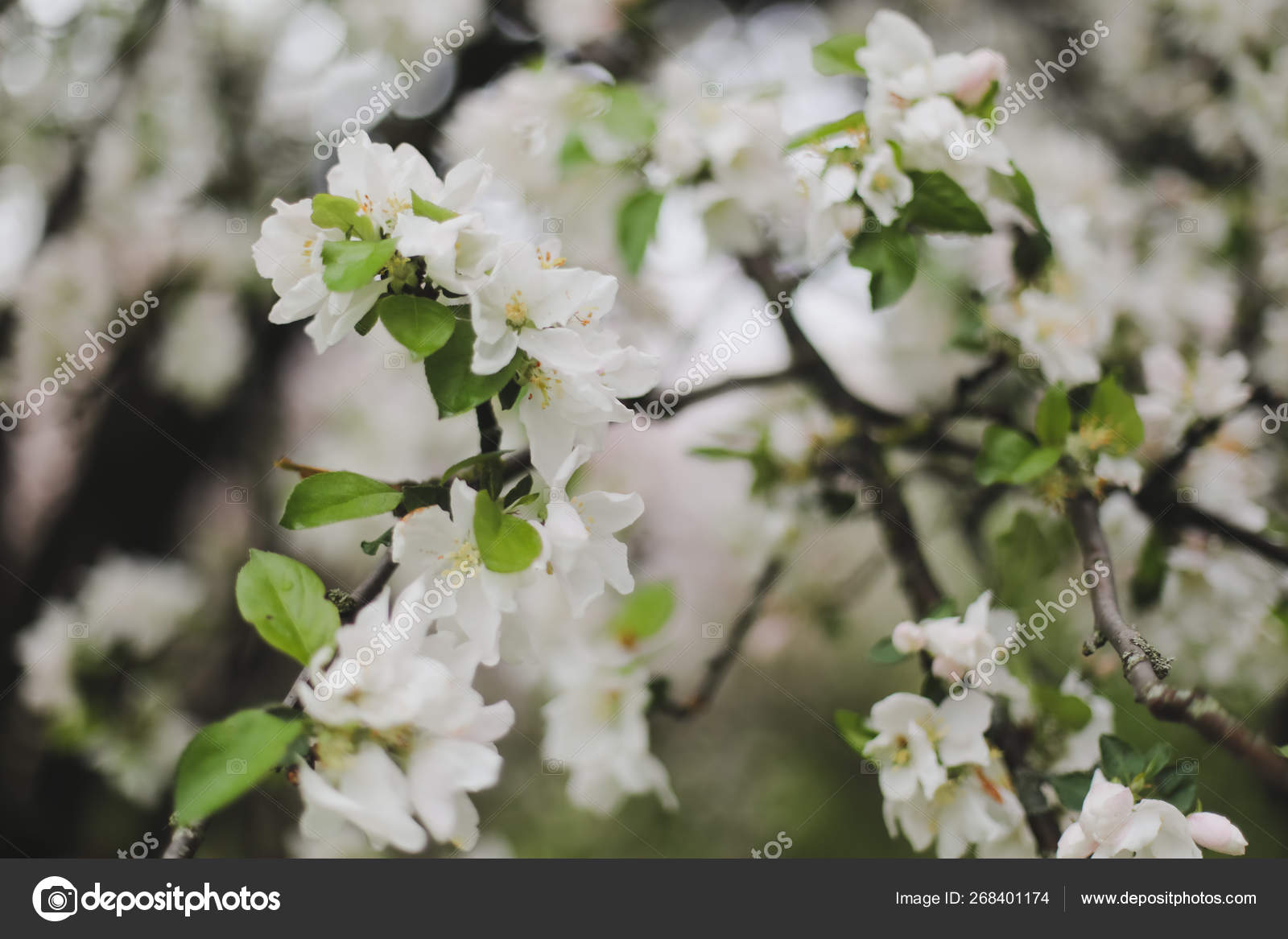 Blossoming Of Cherry Flowers With Green Leaves Branches Of A Tree