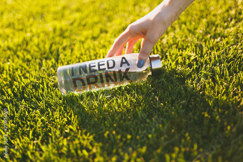 Outstretched Hand To Bottle With Fresh Clean Clear Water With Text