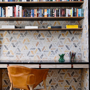 Desk Nook With Wallpaper On Back Of Desk And Shelves
