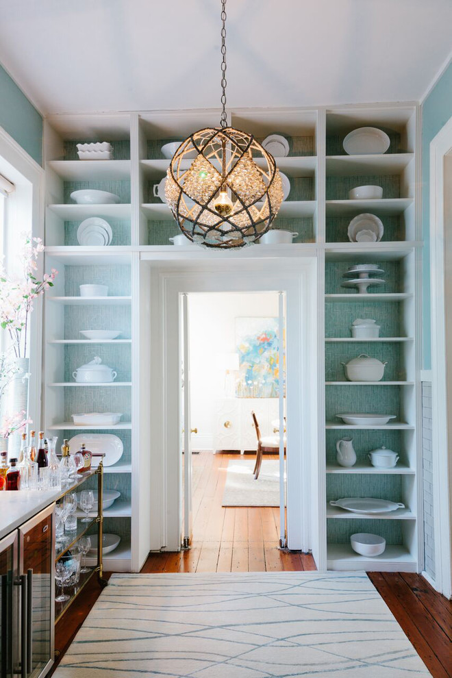 Blue Wallpaper On Back Of Pantry Shelves Transitional Kitchen