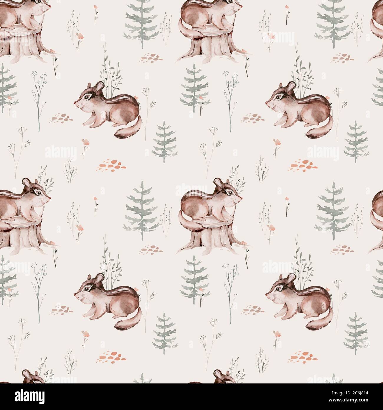 Watercolor Woodland Animals Seamless Pattern Fabric Wallpaper