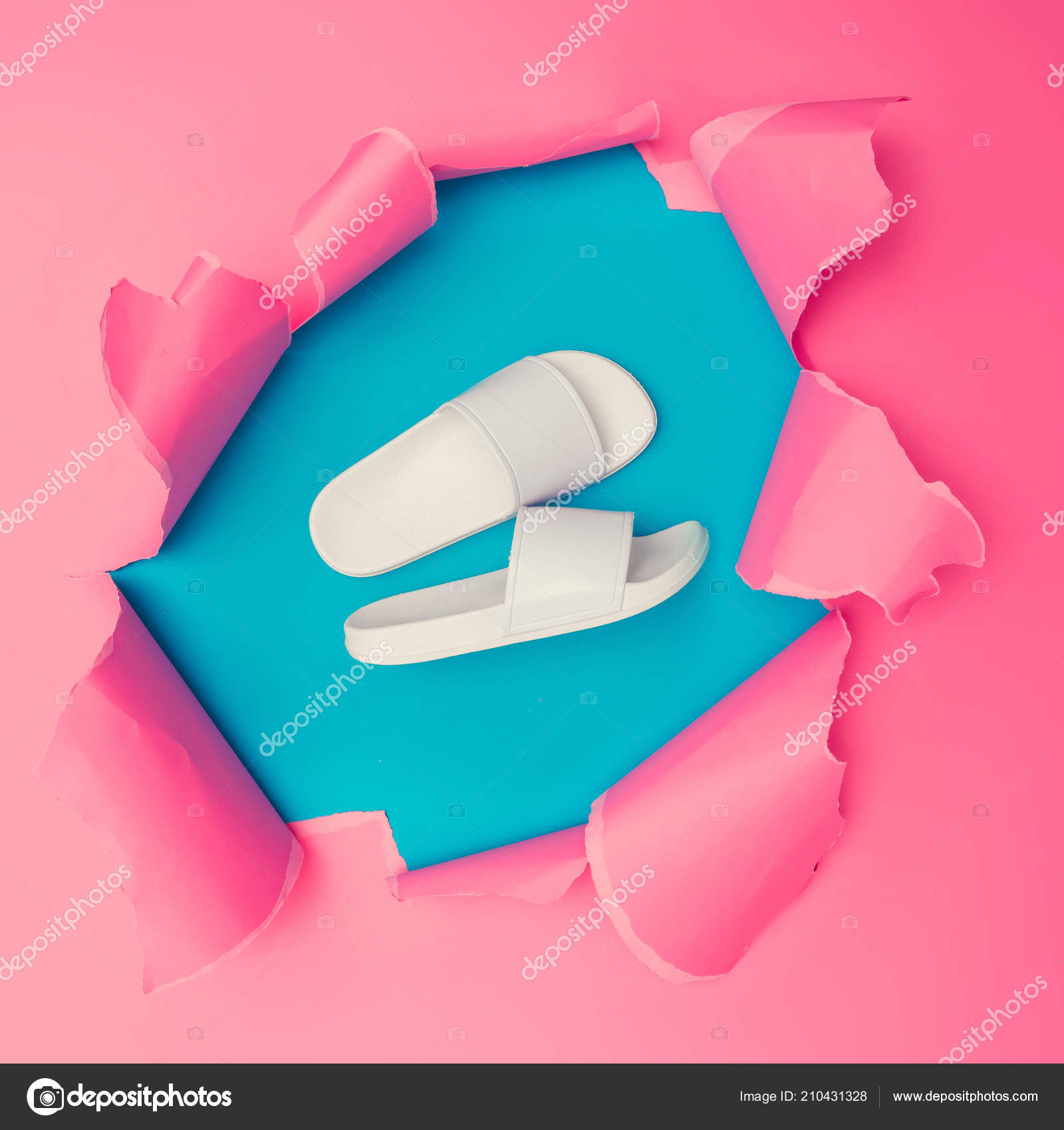 White Beach Slides Burst Hole Vivid Pink Torn Paper Minimal