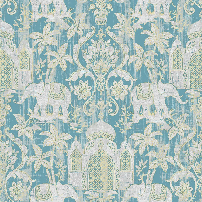 Temple Taj Mahal Elephant Palm Trees Tropical Wallpaper Metallic