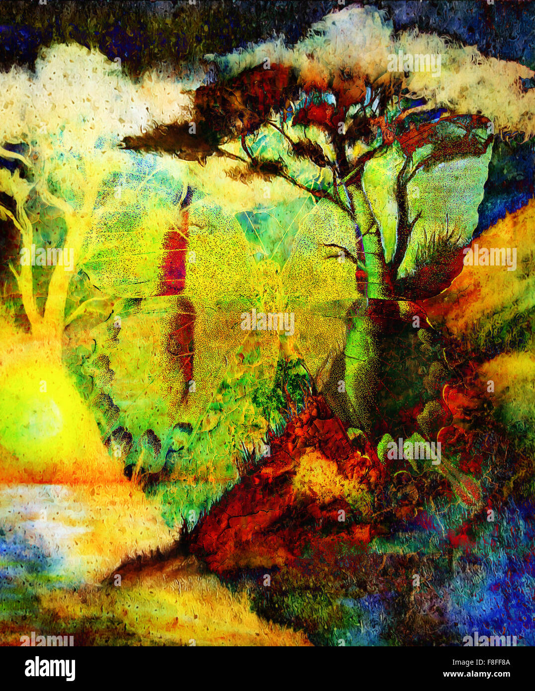 Painting Sunset And Tree Wallpaper Landscape Color Collage